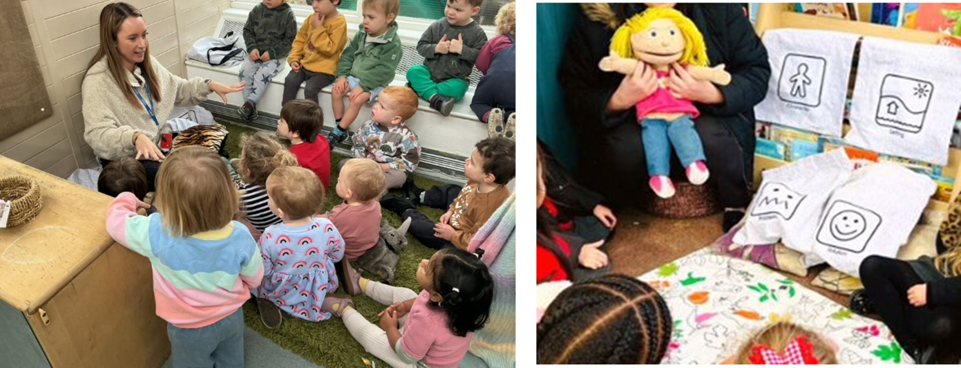 In Green Room, children quickly recognise the symbols and love using them to invent simple stories. They create names for their characters, explore what might happen next, and eagerly share their ideas. The approach strengthens listening and attention skills, encourages collaboration, and helps children build on one another’s creativity as they develop rich, imaginative narratives together.